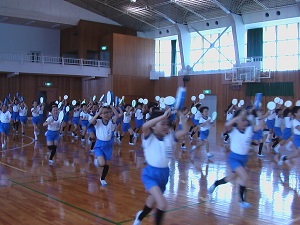 2019年5月14日 14時57分健民体育館での運動会練習が始まりました。実施できるのも、かほく市のバスの運転手さんが学年ごとに何度も送迎してくださるおかげです。ありがとうございます。