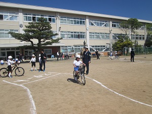 4年生が、警察署の方々から自転車の安全な乗り方を教えていただきました。運動場に作ったコースを使って、一人一人確認しながら乗りました。教えていただいたことをしっかり守って、安全に乗ってくださいね。