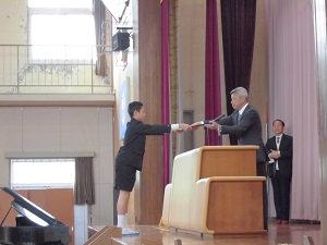 3月1日(金)に、NPO法人清水育英会の藤井副理事をお迎えして、清水賞の授賞式が行われました。校長室にて、藤井副理事から賞状と副賞をいただき、記念撮影。