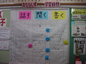 各クラスで、話す・聞く・書く力をふり返り、次の学年までにどんな力をさらに付けるかめあてを決めて、児童玄関前に掲示して取り組んでいます。まなびぃず委員会が確認して、達成できためあてには、花丸がついています。3つの花丸が揃うと、まなびぃず委員会から、「次の学年ばっちりで賞」が贈られるので、どの学年もがんばっています。