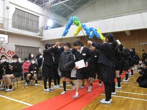レッドカーペットの上を6年生が入場します。1~5年生に出迎えられ、嬉しそうです。
