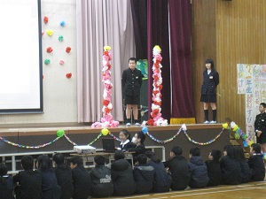 5年生が今日のルールやマナーについて話しました。落ち着いた雰囲気のもと、プログラムが進みました。
