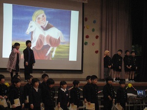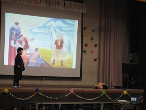 2年生の出し物「スーホの白い馬」です。素敵な群読劇を見せてもらいました。合間に流れる映像や音楽も手伝い、物語の世界に引き込まれました。