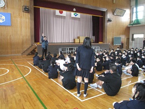 今回は津幡警察署の方に来ていただき、6年生の教室に不審者が入ったという想定で訓練を行いました。体育館で実際に不審者と出会った場合、どんな行動をとれば良いかも学習しました。とっさの時、適切な行動がとれない、声が出ないなど考えられるので、訓練は大切です。