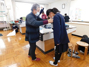 先週に引き続き、ミシンボランティアの方々が、5年2組のエプロン作りの支援に来てくださいました。ミシンの使い方だけでなく、しつけの仕方やアイロンのかけ方など、裁縫の技能を磨くためのコツをたくさん教えていただきました。ありがとうございました。