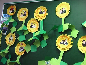 出し物以外の準備も、着々と進んでいます。今日は、1年教室で体育館の飾り図繰りをしていました。大きなひまわりの中には、わんぱくグループの1年生と6年生がなかよく写った写真が貼ってありました。きっと6年生も喜んでくれますね。