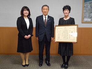 1月25日(金)東京で行われた「第19回環境美化教育優良校等表彰事業」の表彰式で受賞した文部科学大臣賞の報告のため、油野市長を表敬訪問いたしました。山越教育長・山口部長にも同席いただき、長きにわたり取り組んできた海浜クリーン作戦と木津桃の取組を評価されたことを報告しました。