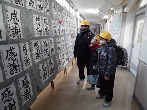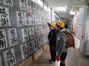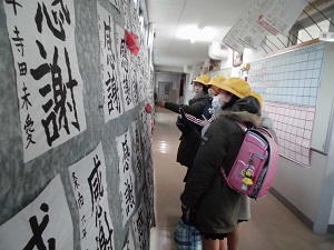 河北郡市書写作品展の作品が、七塚小学校で展示されています。各学校の代表作品だけに、どの作品も見応えがあります。子ども達も、七塚小の児童の作品だけでなく、他校の作品のよさを鑑賞しています。展示は、本日夕方までです。