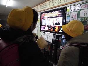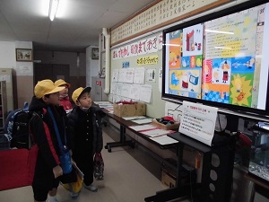 図書委員会からはマナーと家族de読書について、保健委員会からは風邪予防について啓発しています。どちらの番組も、楽しめる内容になっているので、玄関を通る子ども達の足も自然に止まり、番組に見入っています。