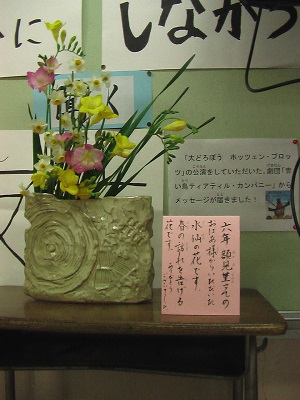 本日、6年生の額見さんのおうちから水仙の花をいただきました。澤野学校CNが、6年生の授業参観で使ったエアリーフローラの花と一緒に、玄関や校長室前に飾ってくれました。春の訪れをみんなで感じています。ありがとうございました。