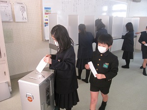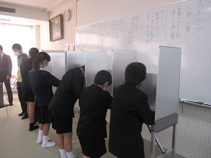 6年生が提案する「よりよい学校づくり」に向けての政策を聞き、投票しました。