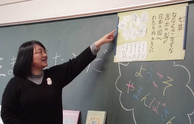 「のはらうた」の詩や「七草がゆ」の手遊び、国語教科書に掲載されている「三まいのおふだ」の読み聞かせをして頂きました。沖縄や津軽、はてまた外国(アイルランド)にも「三まいのおふだ」と似ている話があると聞き、児童たちは驚いていました。最後にそのアイルランドのお話「雄牛のブーコラ」の語りを楽しみました。「三まいのおふだ」はおふだが三枚出てきますが、「雄牛のブーコラ」は雄牛の毛を3本使います。いずれも我が身を助けてくれる働きをします。地域が違っても似たような話が伝わっているのはおもしろいですね。