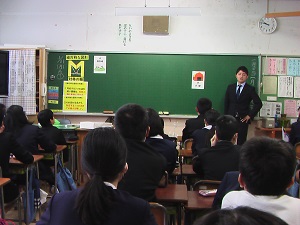 卒業まであと2ヶ月。中学校への進学準備の一環として、河北台中学校の数学担当の木谷先生をお迎えして、出前授業が行われました。中学校の先生のお話を真剣に聞く6年生。いつもより緊張した顔つきです。