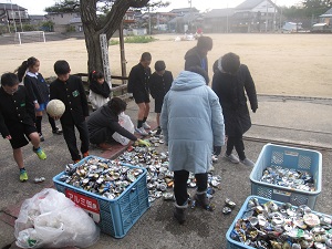 遊んでいた子ども達もアルミ缶をつぶすのを手伝ってくれました。