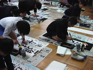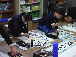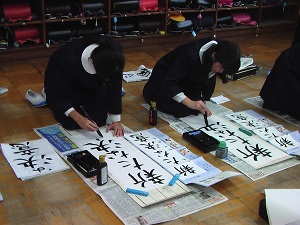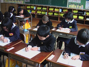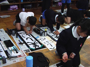 宮城道雄さん作曲の箏曲「春の海」をBGMに、校内書き初め大会を行いました。素敵な調べの中、心を落ち着かせて、どの子も真剣に筆を動かしていました。