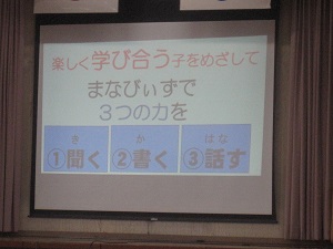 1月の学習目標は、「あたたかな聞き方をしよう」です。まなびぃず委員会の3人が、みんなに呼びかけてくれました。