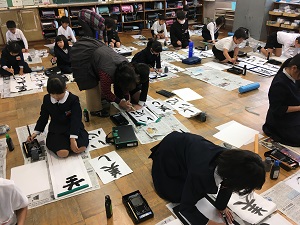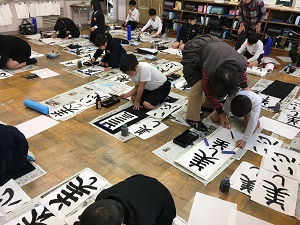 長い書き初め用紙に初めて書くので、字の大きさや中心を揃えて書くのに苦労していましたが、どの子も一生懸命に書いていました。