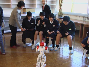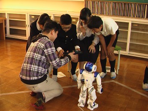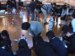 自分で考えたプログラムを入力し実行ボタンを押すと、かわいいロボット”NAO”が応えてくれます。NAOが話したり動いたりする度に、子ども達は歓声を上げながら学んでいました。NAOに話しかける時には、目を見てしっかり声を出さないと反応してくれないので、コミュニケーションが大切なことも学んでいました。友だち同士で教え合ったり、チームで協力してプログラミングしたりと、学び合いながら楽しんでいました。