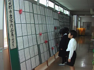 河北郡市の低学年学校代表の書写作品が巡回展示されています。