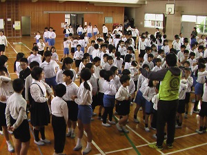 わんぱく班での掃除中という時間設定に加え、予告無しなので、1年生が無事に避難できるか心配しましたが、高学年がうまくリードして全員素早く避難することができました。避難後には、学校みんなの命を守るために気をつけることを確認することもできました。