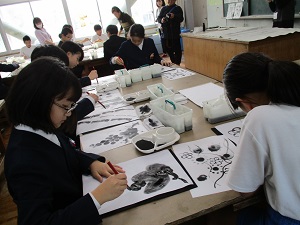 初めての水墨画体験でしたが、参加した児童は、それぞれ自分のイメージを筆に託して、楽しく描いていました。