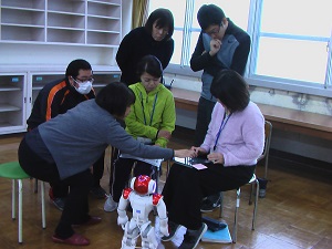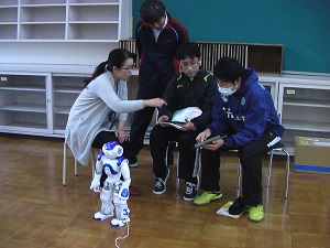 厚生労働省ITマスターの福田さんからプログラミングの方法を教えていただきながら、かわいいロボット”NAO”を操作します。プログラミング通りにロボットが動き、教師も楽しみながら学びました。