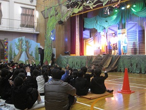 今年は、劇団・青い鳥ティアティカル・カンパニーによるミュージカル劇『大どろぼう ホッツェンプロッツ』を鑑賞しました。生の迫力ある演技に魅了され、子ども達は歓声を上げたり笑ったりと、1時間半があっという間に過ぎました。みごとな舞台装置や照明にも、子ども達は感激していました。