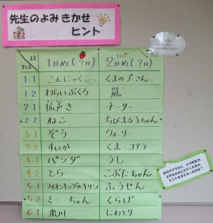 子ども達は、ヒントを見て「パンダって○○先生やったんか~」など、読み聞かせを始める前から、楽しんでいたようです。もう一回行う予定です。次はどの先生かな?