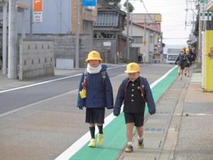 児童の安全な登下校のためにと、かねてから要望していた木津地区でのグリーンベルトが設置されました。交通量の多い道路なので、グリーンベルトを使い、安全に気をつけて登下校してね。