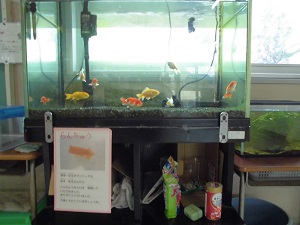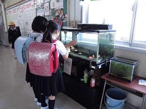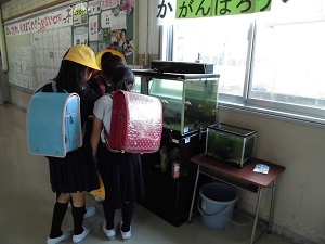 生き物が大好きな七塚っ子は、水槽の前を通るたびにのぞき込み、心を癒やしています。