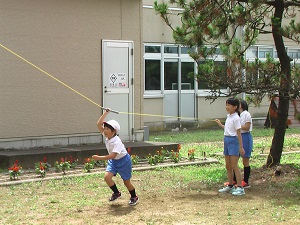 この遊具は、本校の体力面での強みである「投の運動力」をさらに向上させるために、片山教諭・土田教諭・清水教諭が力を合わせて作ったものです。子ども達に今大人気の遊具です。