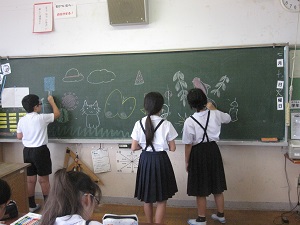 送る相手は地域に住むお年寄りや、学校のために協力していただいているボランティアの方たちです。一枚一枚ていねいにかきました。5,6年生が黒板に絵をかくことで低学年の子も絵を描きやすかったようです。