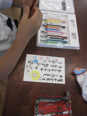 わんぱく班で、暑中見舞いのはがきをかきました。