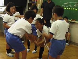 4年生の外国語の学習の様子です。アルファベットを使って英単語を完成させるゲームをしました。子ども達はまだ難しい表現を使うことができませんが,知っている単語や表現を使って楽しそうに交流しています。