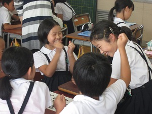 2018年7月2日 14時46分4年生の外国語の学習の様子です。アルファベットを使って英単語を完成させるゲームをしました。子ども達はまだ難しい表現を使うことができませんが,知っている単語や表現を使って楽しそうに交流しています。