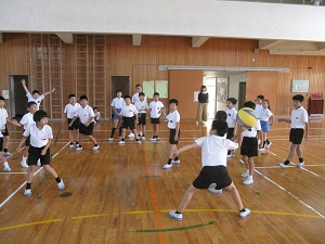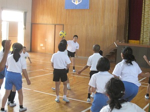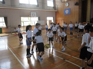 体育館に4クラスの子が集まり、楽しそうにボールを追いかけていました。