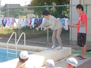 プール監視をする際には、1人で対応するのでなくチームで行うことが大切であることを教えていただき、参加者みんなで危機意識を高め合いました。学校でも、事故が起きないように、プールでの安全指導を行っていきます。