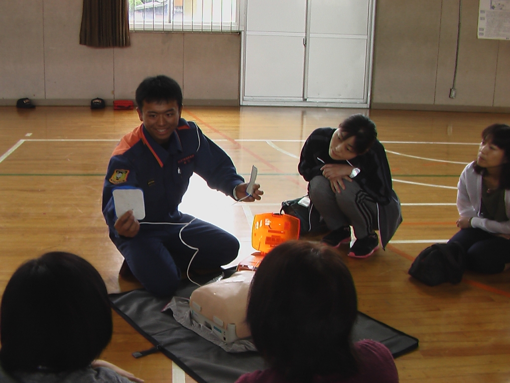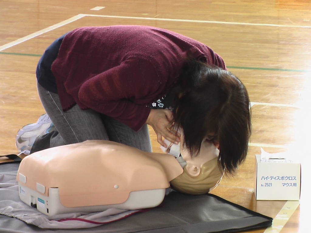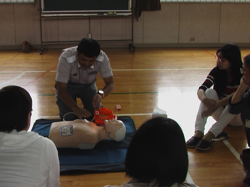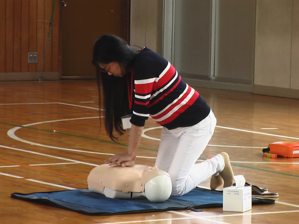 胸骨圧迫の後人工呼吸を2回行う実技を全員で行いました。その後、AEDの使い方も教わりました。