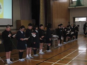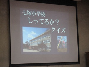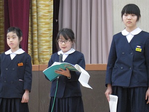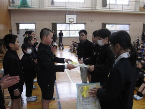 4つの表彰、七塚小学校しってるかクイズ、3月のめあて(1の2発表)、よいノート紹介、図書委員会による発表、今月の歌と、盛りだくさんの内容でした。