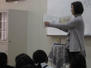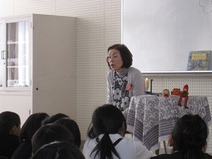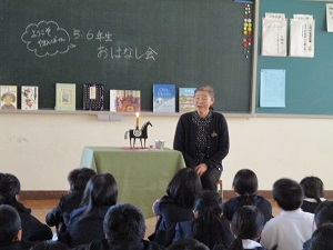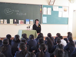 お話会が行われました。読み聞かせボランティアとして「やまんば」のメンバーがやってきました。低中高学年に分かれて読み聞かせをしていただきました。