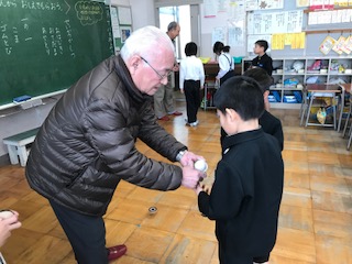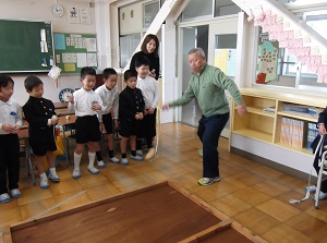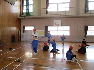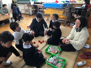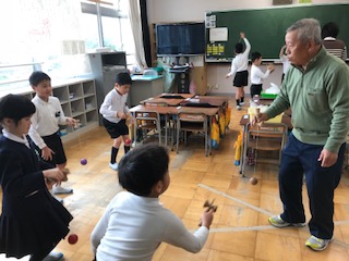 けん玉、こままわし、あやとり、ゴム跳び、お手玉、おはじきなど、1年生が今まで体験したことのない遊びを体験することができました。