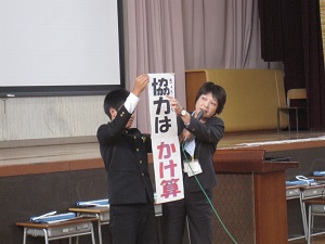 校長先生が「協力はかけ算」というお話をしました。一人一人が2の力を発揮すると、たし算の時よりも大きな力を出せること、集団に0の人がいると集団としての力は0になってしまうこと等の話を聞きました。