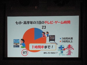 30年前の小学生に比べて、現在の小学生の歩く歩数が大幅に減っている(半分以下になっている)こと、30分以上の運動ができていない人の人数が増え、テレビ・ゲームの時間が推奨されている1時間半を大幅に超えていることなどの紹介がありました。
