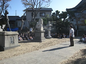 避難場所は海抜24mにある神明神社でした。保育園との合同避難訓練は初めての取り組みでしたが、児童は素早く、そして静かに避難することができました。