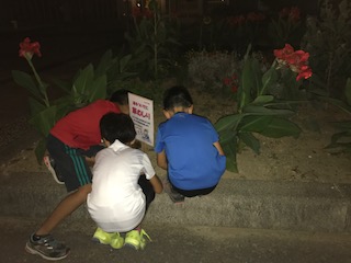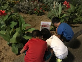 夜,河北台中学校の花壇の草むしりボランティアを七塚小学校の児童が行っていました。