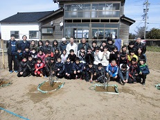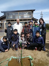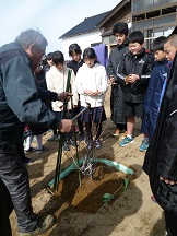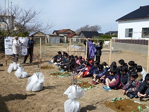 この後、七塚小学校のOBで造園業をされている広瀬さんの指導のもと、4つのグループに分かれて、木津桃の苗木をていねいに植えました。