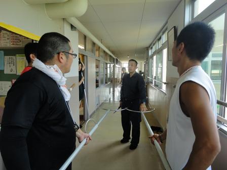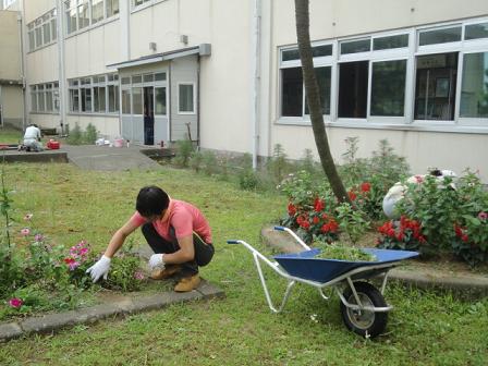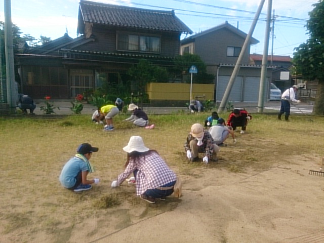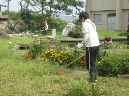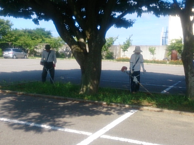 作業終了後、学校の隣にお住まいの高沢さんが校長先生と学務員の宮嵜さんと駐車場の草を草刈り機で刈ってくださいました。駐車場もきれいになりました。