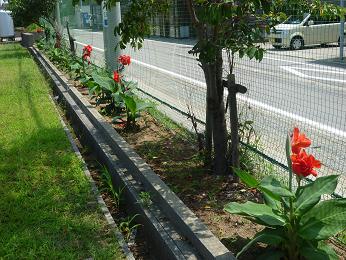 学校前の道路沿いには、赤いカンナ