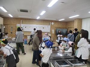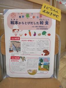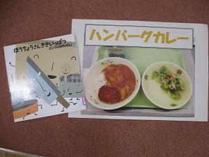 今日の給食はハンバーグカレーでした。そしてこのメニューは、宮西達也さんが書いた「ほうちょうさんききいっぱつ」という絵本から飛び出た給食「絵本給食」です。それにちなんで、今日の長休みには、図書館で学校司書さんによるお話会もあり、たくさんのお友達が来てくれました。大好きな絵本と給食がコラボしたとっても楽しい企画ですね。金曜日にも「絵本給食」が予定されています。どんなメニューかな?どんな絵本かな?楽しみですね。