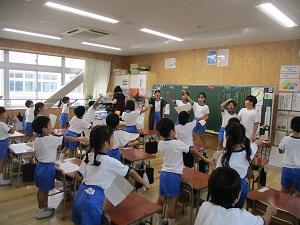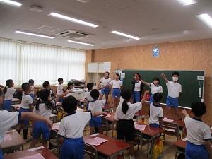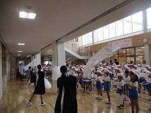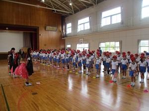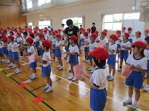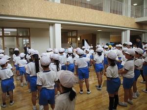 今日は雨が時々降るとっても蒸し暑い1日でしたね。そんな中、1・2年生は体育館で団体競技の玉入れの練習をしていました。音楽に合わせて、ダンスをした後、みんなで玉を入れるというスタイルで、とってもかわいい玉入れでしたよ。